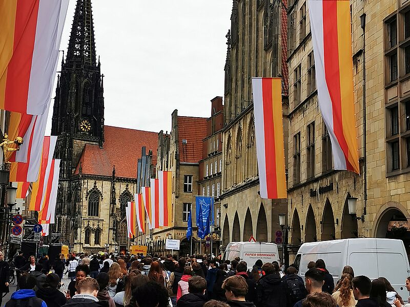 Am Freitag, 12.05. kommen ca. 7000 Schüler*innen aus Münsters Schulen nach einem Sternmarsch von ihren Schulen auf dem Domplatz zusammen, um ein Zeichen zu setzen und ihren Wunsch nach Frieden zu demonstrieren.