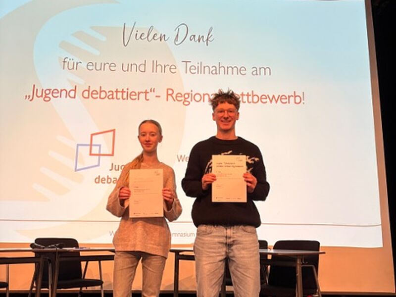 Ebenfalls engagiert und überzeugend präsentierten sich Levin Bieletzki (9b) sowie Charlotte Gärtner (EF). Auch wenn sie den Einzug ins Finale knapp verpassten, zeigten sie großes rhetorisches Geschick und eine beeindruckende inhaltliche Tiefe in den Vorrunden.