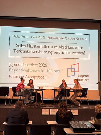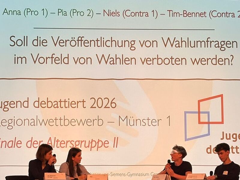 In der Altersgruppe I überzeugten die Teilnehmenden mit Sachkenntnis, klarer Struktur und fairer Gesprächsführung. Besonders erfolgreich war Liora Bühning (8d), die sich mit einer starken Leistung einen hervorragenden 3. Platz in der Region Münster sicherte. Mit durchdachten Argumenten und ruhiger Präsenz im Finale zur Frage nach einer Versicherungspflicht für Haustiere bewies sie eindrucksvoll, wie reflektiert strittige Fragen auf großer Bühne debattiert werden können.