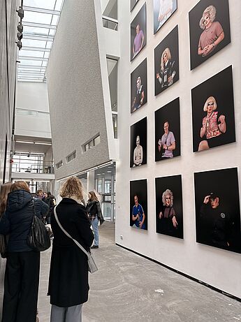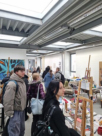 Studierende führten uns durch die riesige und extrem vielfältige Ausstellung, brachten die Schüler*innen mit den Künstler*innen ins Gespräch und erklärten die Ausstellungskonzepte der einzelnen „Klassen“. Die Studierenden zeigten Arbeiten zu unterschiedlichsten Themen und Techniken von Malerei, über filmende Gottesanbeterinnen, durch deren „Augen“ ein Kurs den anderen in einem völlig anderen Raum beobachten konnte, viele Plastiken, Film, Installationen und kreative Mitmachprojekte wie Murmelbahnen oder Sportfelder in den Ateliers.