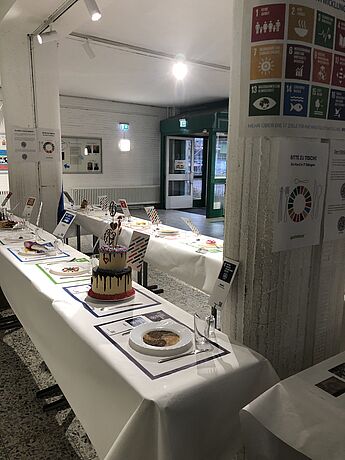 Die Gestaltung der Teller stammt von der Künstlerin Veronika Angloher. Die 17 Gerichte präsentieren sich an einer gedeckten Tafel. Hochwertige Bildung wird zur Buchstabensuppe, Gesundheit zum pillengespickten Donut. Die Exponate sind ein Hingucker für alle und machen Appetit darauf, mehr zu erfahren.