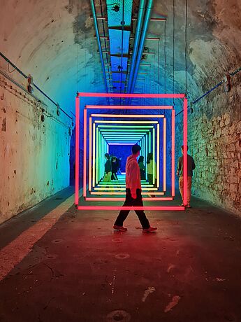 Im ehemaligen Braukeller der Lindenbrauerei findet man seit 20 Jahren das erste und weltweit einzige Museum, welches ausschließlich Lichtkunstwerke ausstellt. Dort erfüllen Lichtinstallationen die alten Gewölbe und vereinnahmen Raum und Körper. Die allumschließenden Werke verschiedener internationaler Künstlerinnen und Künstler forderten die Schülerinnen und Schüler sowie die Lehrpersonen nicht nur visuell heraus. Neben dem Sehsinn, spielten die Werke mit verschiedenen Ebenen der Wahrnehmung. Besonders die begehbare Licht- und Soundinstallation von Wolfgang Bittner (DE), Lyndsey Housden (UK), Yoko Seyama (JP) und Jeroen Uyttendaele (BE) überraschte und lud ein zur Selbsterkundung einer sich stetig verändernden galaktischen Landschaft. Neben beeindruckenden Fotografien aus der Jubiläumsausstellung "Faszination Licht" sind zahlreiche spannende Diskussion im Kunst Leistungskurs über aktuelle Themen wie u.a. "Kommunikation" in und mit Kunstwerken sowie die Besonderheit von ortsspezifischen Installationen entstanden.