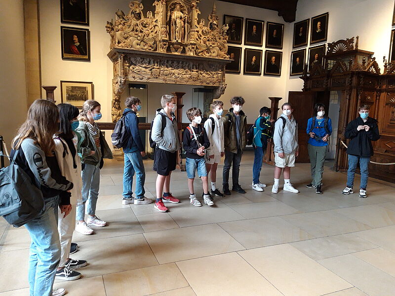 Pax optima rerum – übersetzt "Frieden ist das höchste Gut": diese Sentenz konnten die Schüler*innen der Klasse 7a als Motto des Westfälischen Friedens an der Kaminplatte des historischen Rathauses am Freitag lesen. Nach der Beschäftigung mit dem Dreißigjährigen Krieg im Geschichtsunterricht hatten die Schülerinnen und Schüler im Rahmen einer Exkursion Gelegenheit, einen historischen Ort in der eigenen Heimatstadt zu besuchen. Bei einem Stadtrundgang wurde für die 7a deutlich, dass unsere Stadt viele Anlässe zur Beschäftigung mit der Geschichte zu bieten hat.