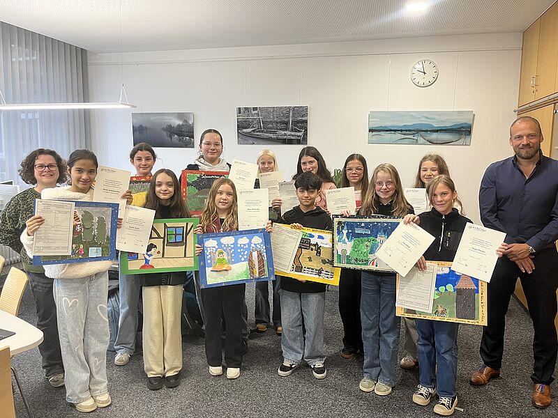 Gewonnen haben in dem Projekt „Märchenhafte Zauberwelten in Farbe, Form und Wort“: Emma P., Luisa R. und Miran M. aus der 6a, Pia A. aus der 6c und Mailin P. Mayla S., Evenlyn Z., Mia St, Marie W. aus der 6e. Die Schülerinnen und Schüler gestalteten während den musisch-künstlerischen Projekttagen interaktive Collagen zu Märchen in Wort und Bild und erstellten eine Gemeinschaftsmappe aus ihren Malereien. Fina H., Lilou H. und Clara St. aus der 7d überzeugten die Jury mit ihrem Friedensdenkmal, welches sie im Kunstunterricht zum Projekt "Denk mal - Frieden“ aus Ton und Alltagsmaterialien gestalteten.